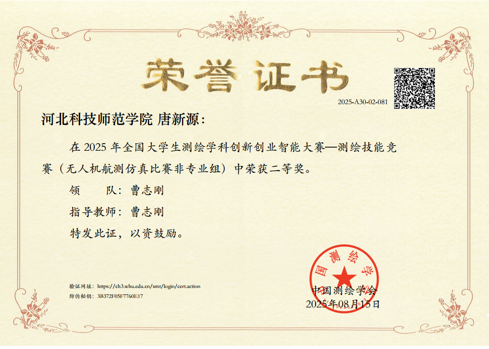 经过激烈角逐,由公司太阳成集团tyc151cc曹志刚老师指导的土木工程专业唐新源同学凭借平时的刻苦训练和线上仿真赛场上的沉着应对,荣获技能竞赛非专业组“无人机航测仿真比赛”二等奖。